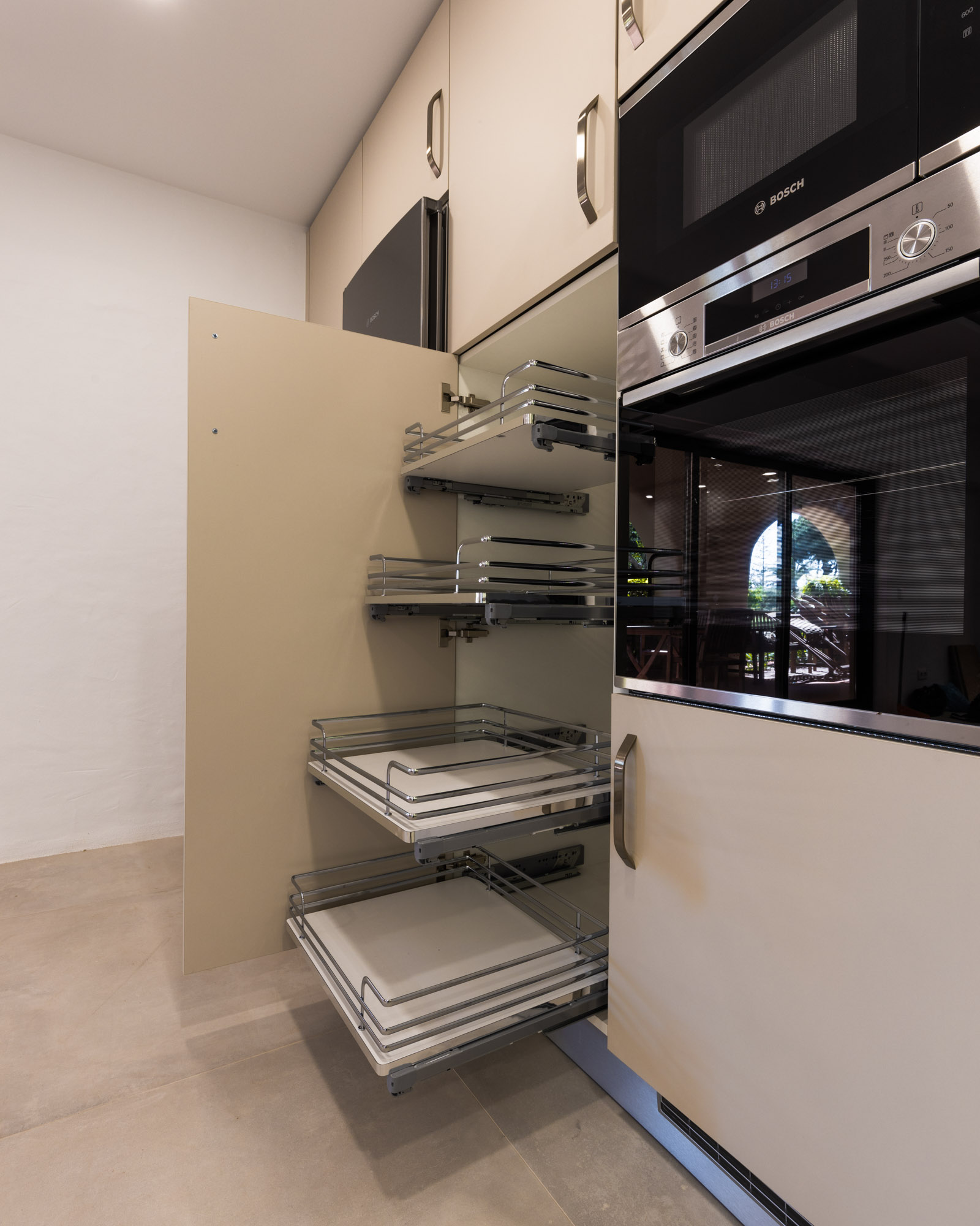 Os cestos extraíveis dentro da coluna constituem uma solução extremamente prática, para tornar a cozinha ainda mais acessível e ergonómica.